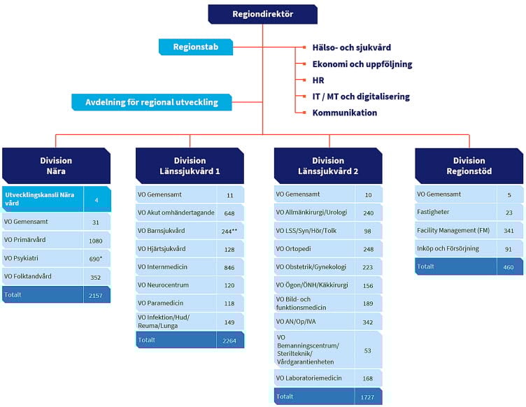 Bild 1: Förslag ny divisionsstruktur med antal medarbetare. *Inklusive barn- och ungdomspsykiatrin **Exklusive barn- och ungdomspsykiatrin. Antalet medarbetare i divisioner och verksamhetsområden är en ögonblicksbild av hur medarbetarantalet såg ut den 31 december 2024 och presenteras i syfte att underlätta förståelsen för verksamheternas omfattning idag. Beslut om förändring av verksamhetsområden och dess placering i organisationen måste tillhöra verksamheten.
