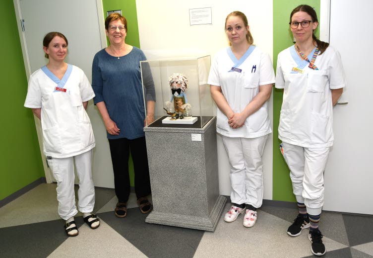 Ebba Ringqvist, Marita Eriksson, Rebecka Wennberg och Vilhelmina Lidström i korridoren på Laponia hälsocentral bredvid konstverket Plåsterpojken av Anna Sjons Nilsson.