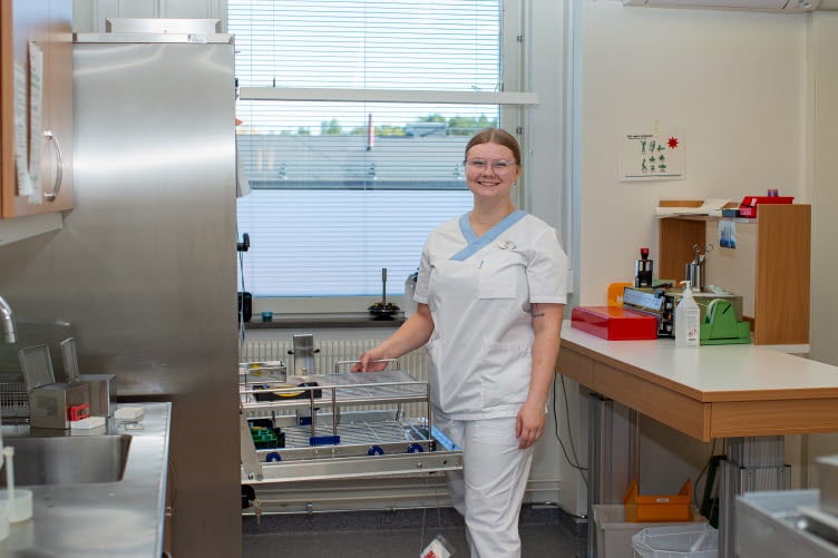 Tilde har lärt sig vilka rutiner som gäller i sterilrummet.